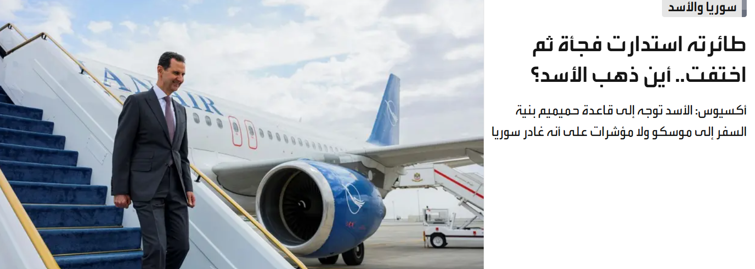 وأظهرت بيانات موقع “فلايت رادار” أن طائرة تابعة للخطوط الجوية السورية يعتقد أن الأسد استقلها، أقلعت من مطار دمشق، في الوقت الذي سيطرت به فصائل المعارضة على العاصمة